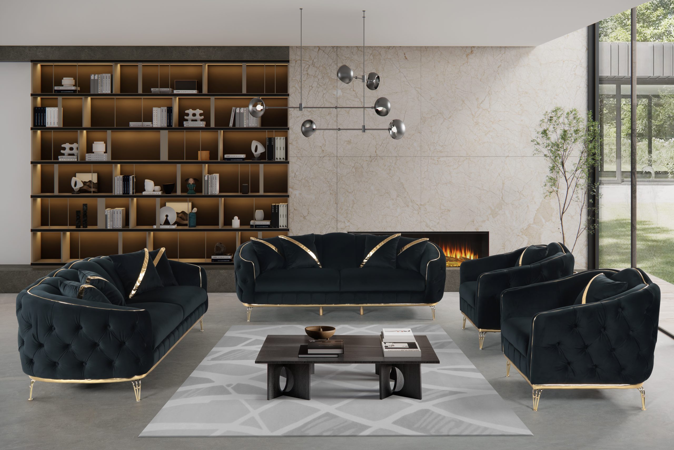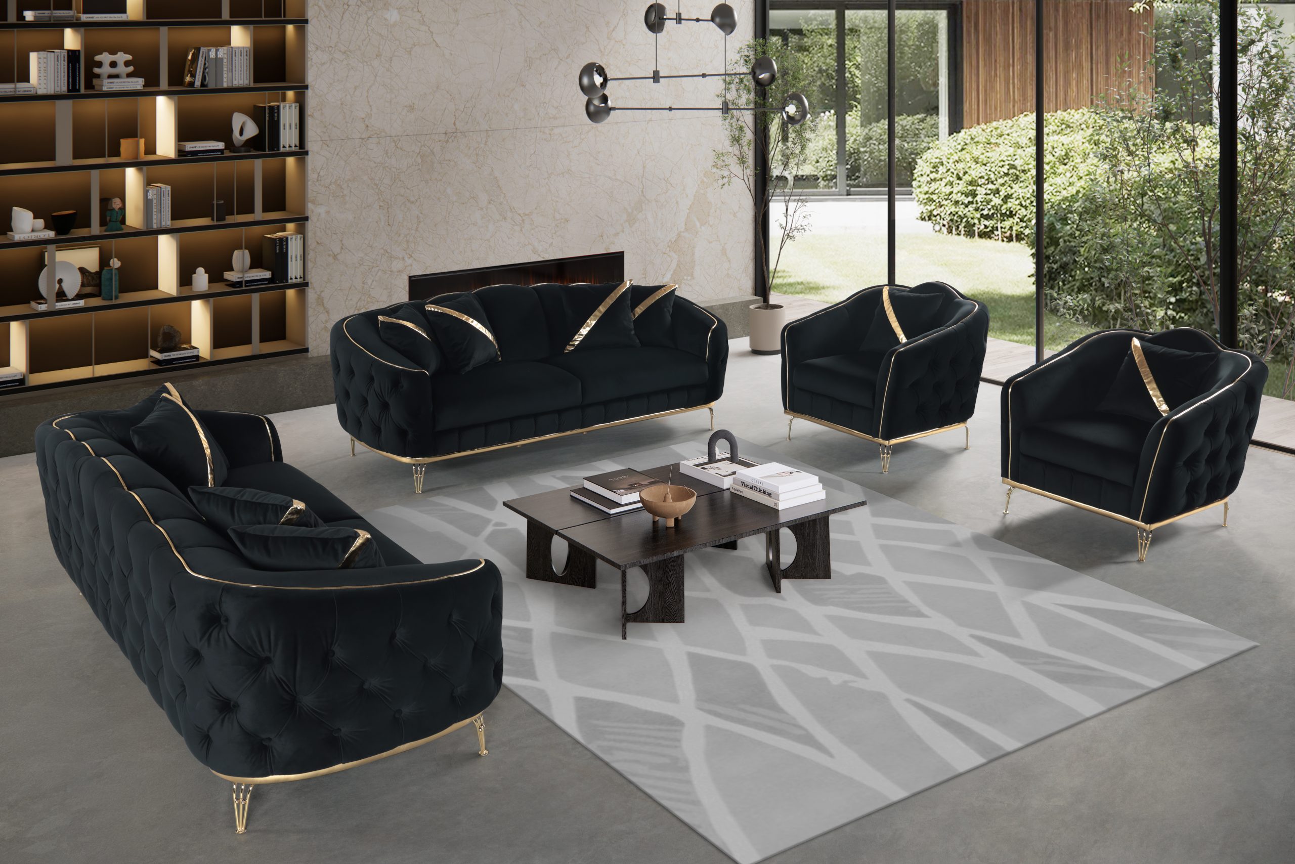 Mina soffgrupp i svart med guld detaljer 3+3+1+1